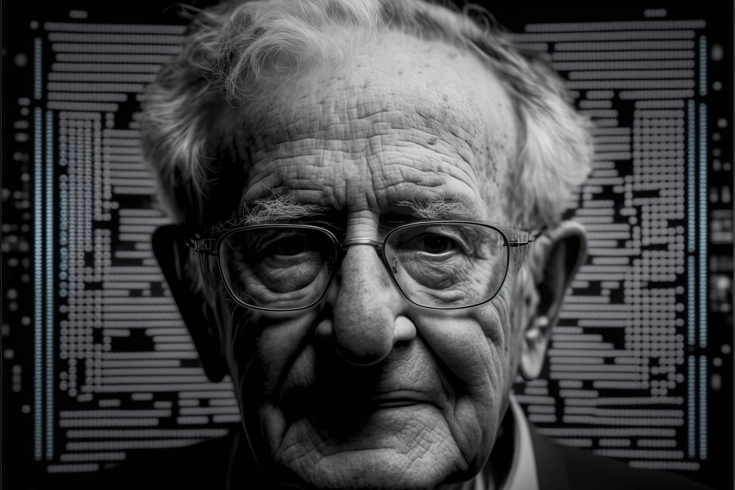 Midjourney: artificial intelligence is talking to a portrait of Noam Chomsky --ar 3:2